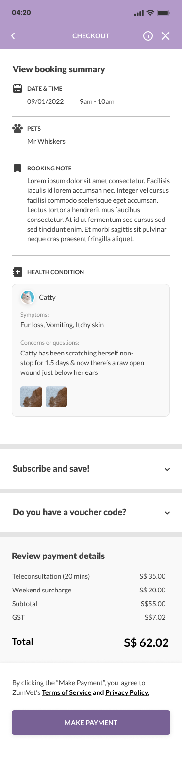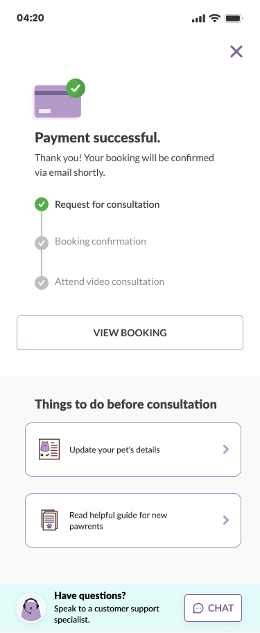 With the improved booking flow, we did sketches and wireframing to better envision the process and layout of the new features. The key iterations focused on creating an online booking system that allows users to view available booking slots of 20 mins timeframes. In order for the booking slots to be made available, we had to work with our operations team to come up with a vet roster. To enhance the booking process, we also aimed to improve the Health Conditions UI, making information inputs to be more intuitive and userfriendly by having common symptoms presented as quick select options. This reduces the effort needed for users to type and spell symptoms; reducing the risk of human error with mispellings. With the introduction of booking slots, we are able to give users an immediate confirmation of their booking, addressing the persona’s pain of multiple communication and long wait time. It also allows the business to take immediate payment to secure the slot.